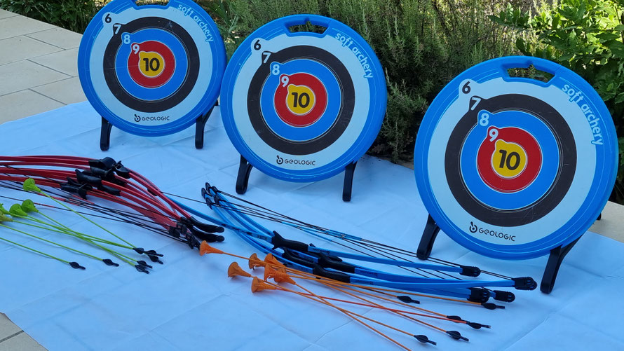 Kit composé d’une structure gonflable, de 4 arcs et de flèches adaptées (embouts en mousse sans danger). 4 balles sont en suspension, maintenues par des jets d'air. A vous de les toucher !!