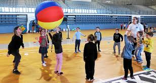 ballon géant de 1m de diamètre, très léger spécialement conçu pour le jeu du "Kinball" livré avec un gonfleur spécial, 3 jeux de 6 chasubles de trois couleurs différentes (soit 18 chasubles).